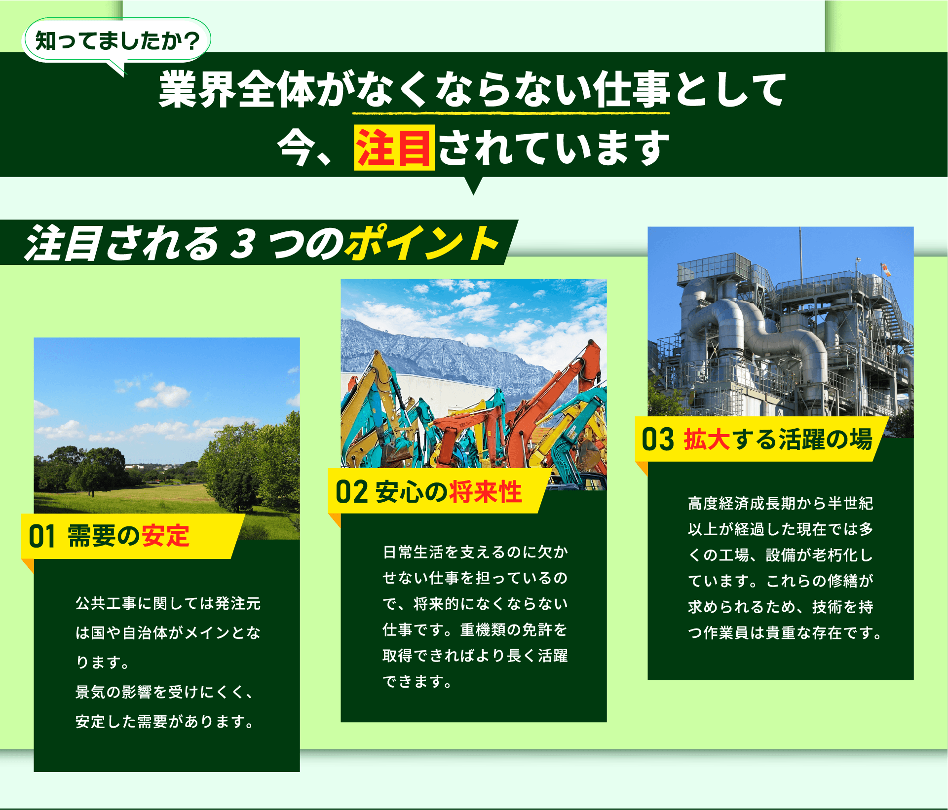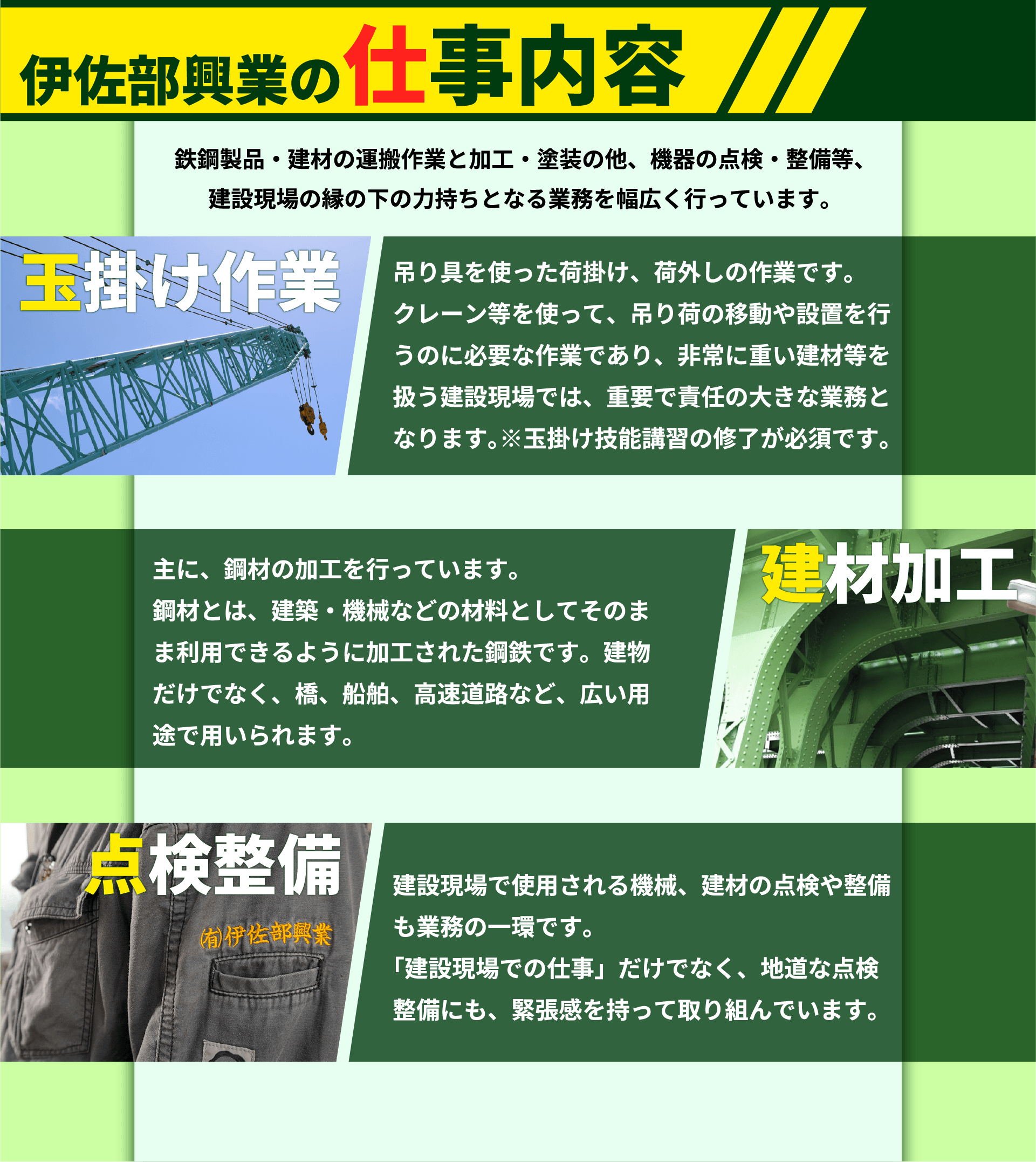 玉掛け作業 / 建材の運搬・加工・塗装 / 機器の点検・整備 等